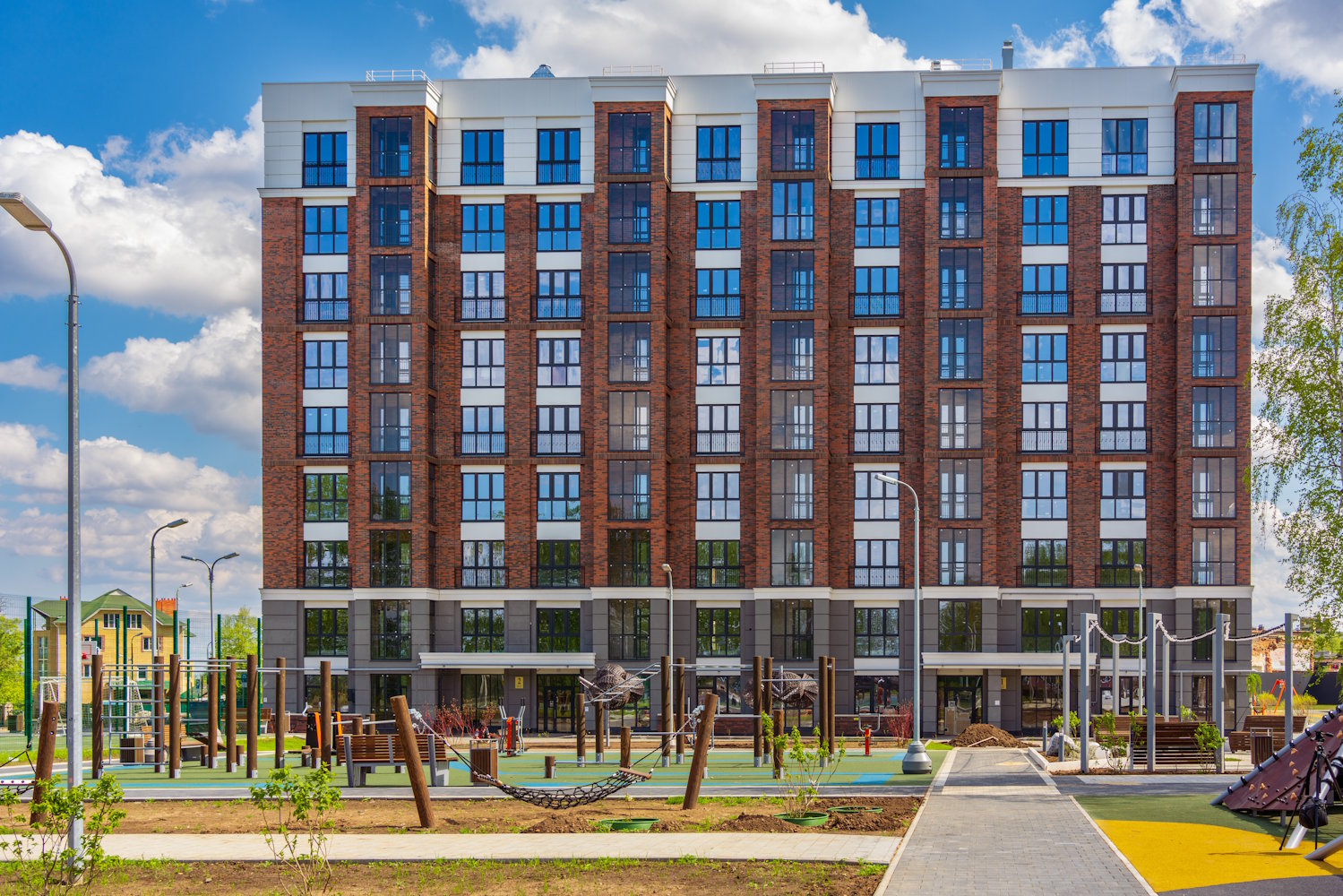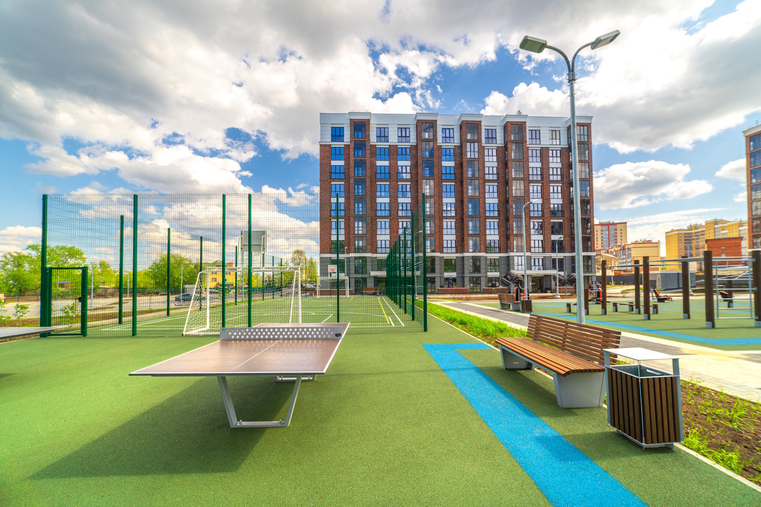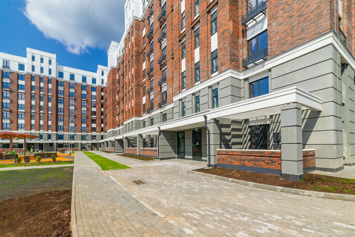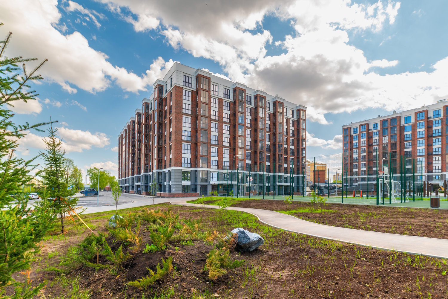 Придомовая территория полностью огорожена, что исключает проникновение на нее посторонних лиц. Выполнена концепция «двор без машин», большое внимание уделено озеленению и ландшафтному оформлению территории дома. Безбарьерная среда: все входы выполнены на уровне земли.