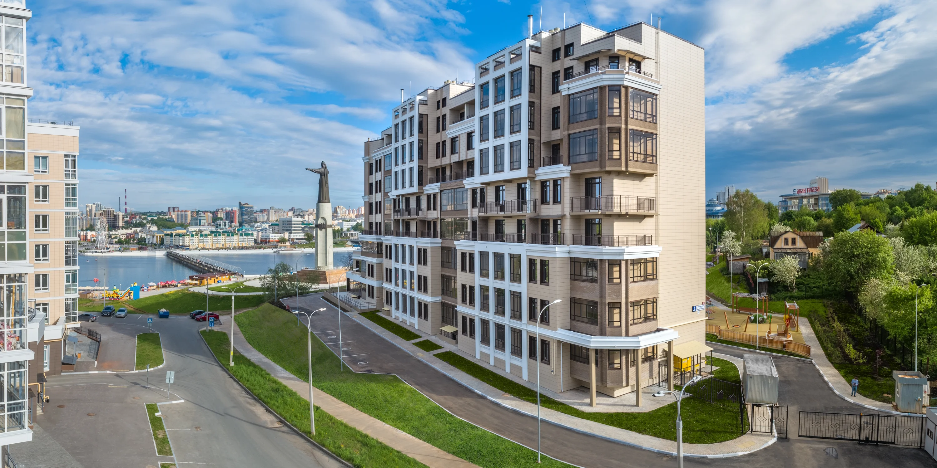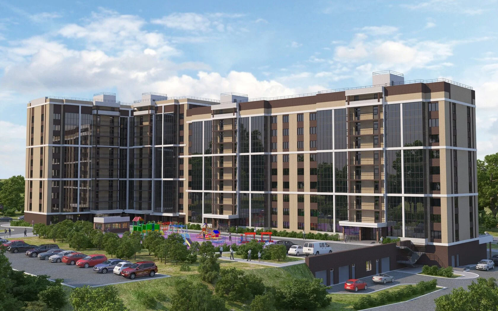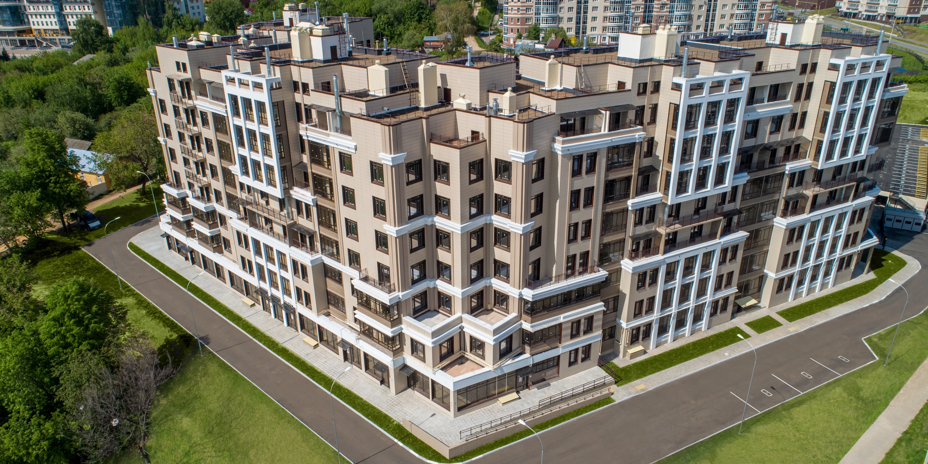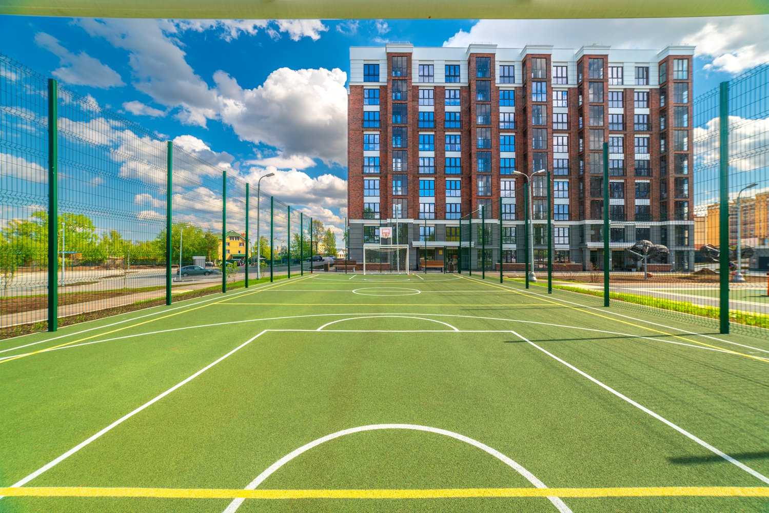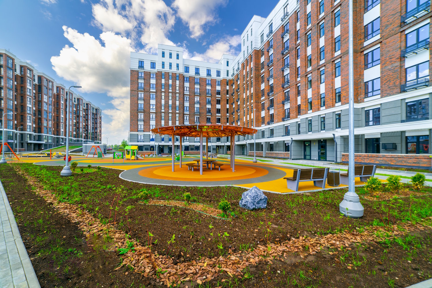 Придомовая территория полностью огорожена, что исключает проникновение на нее посторонних лиц. Выполнена концепция «двор без машин», большое внимание уделено озеленению и ландшафтному оформлению территории дома. Безбарьерная среда: все входы выполнены на уровне земли.