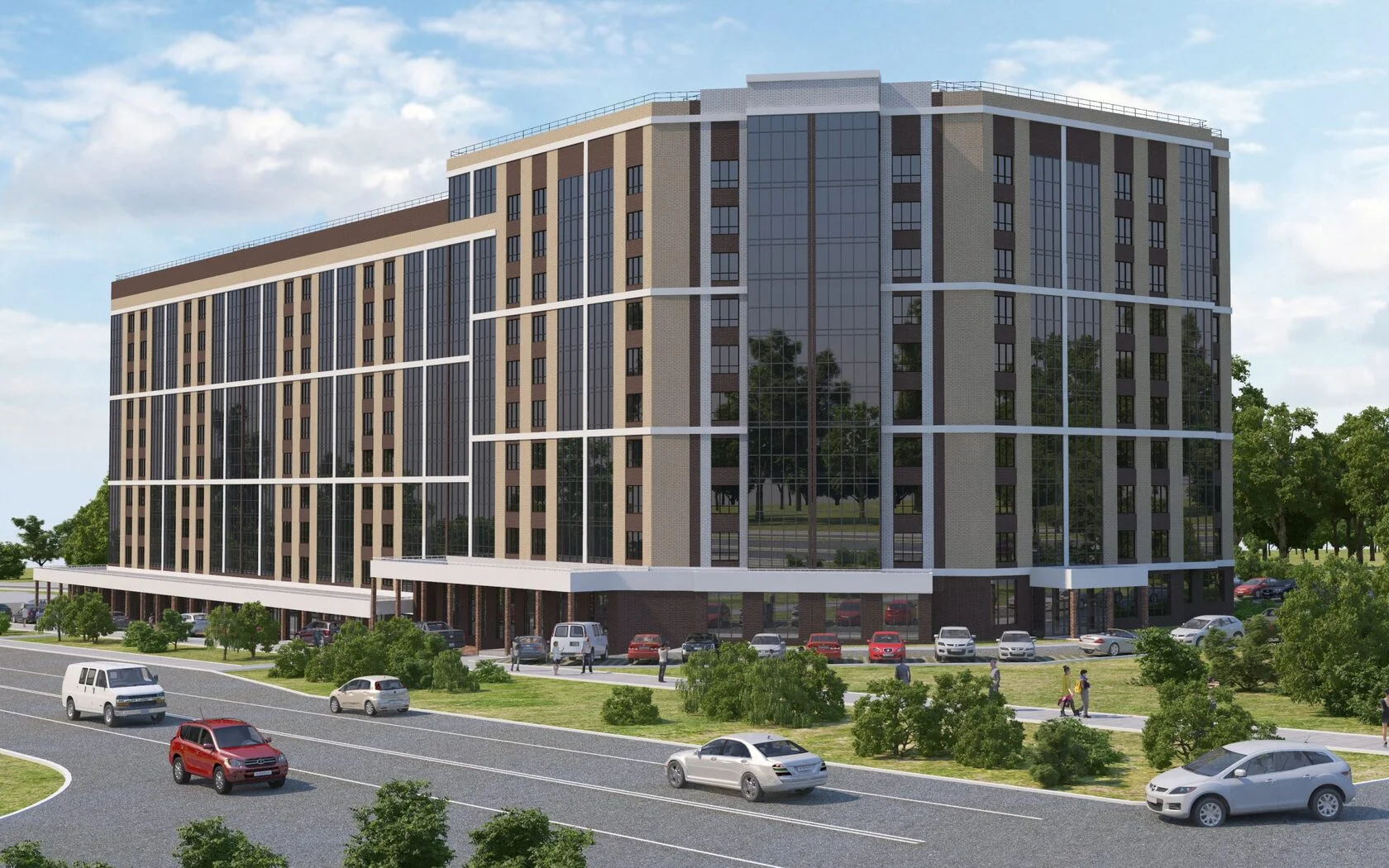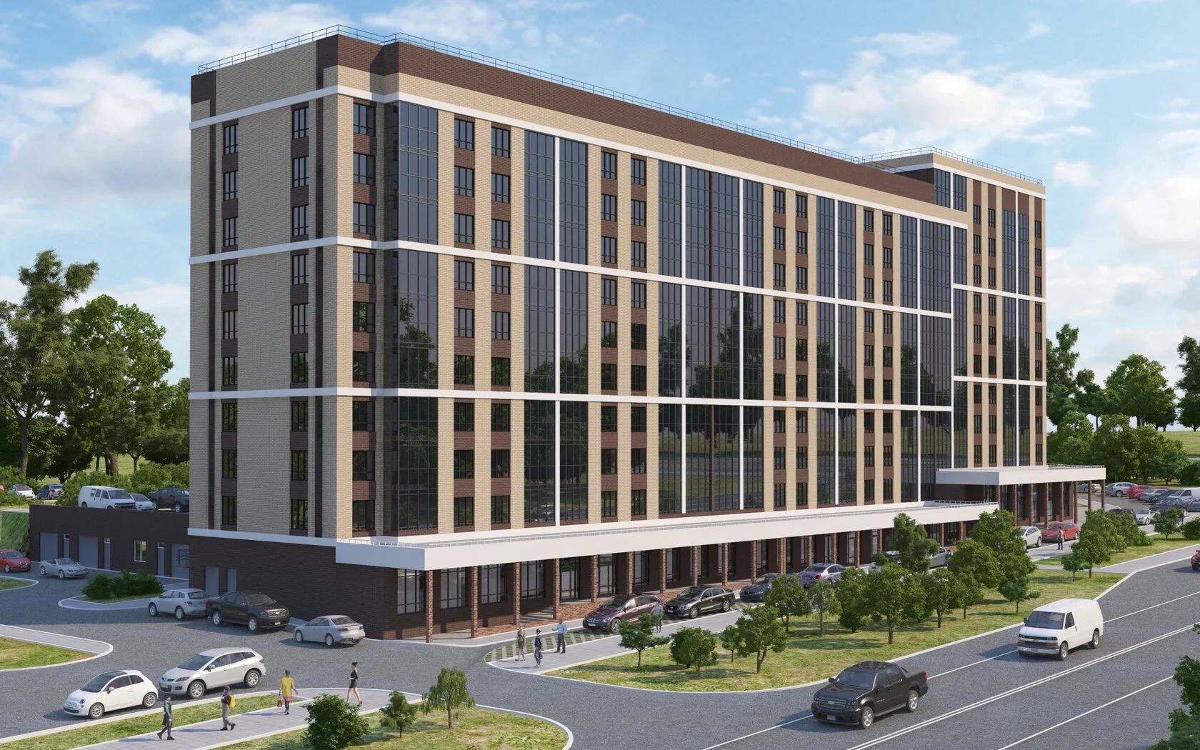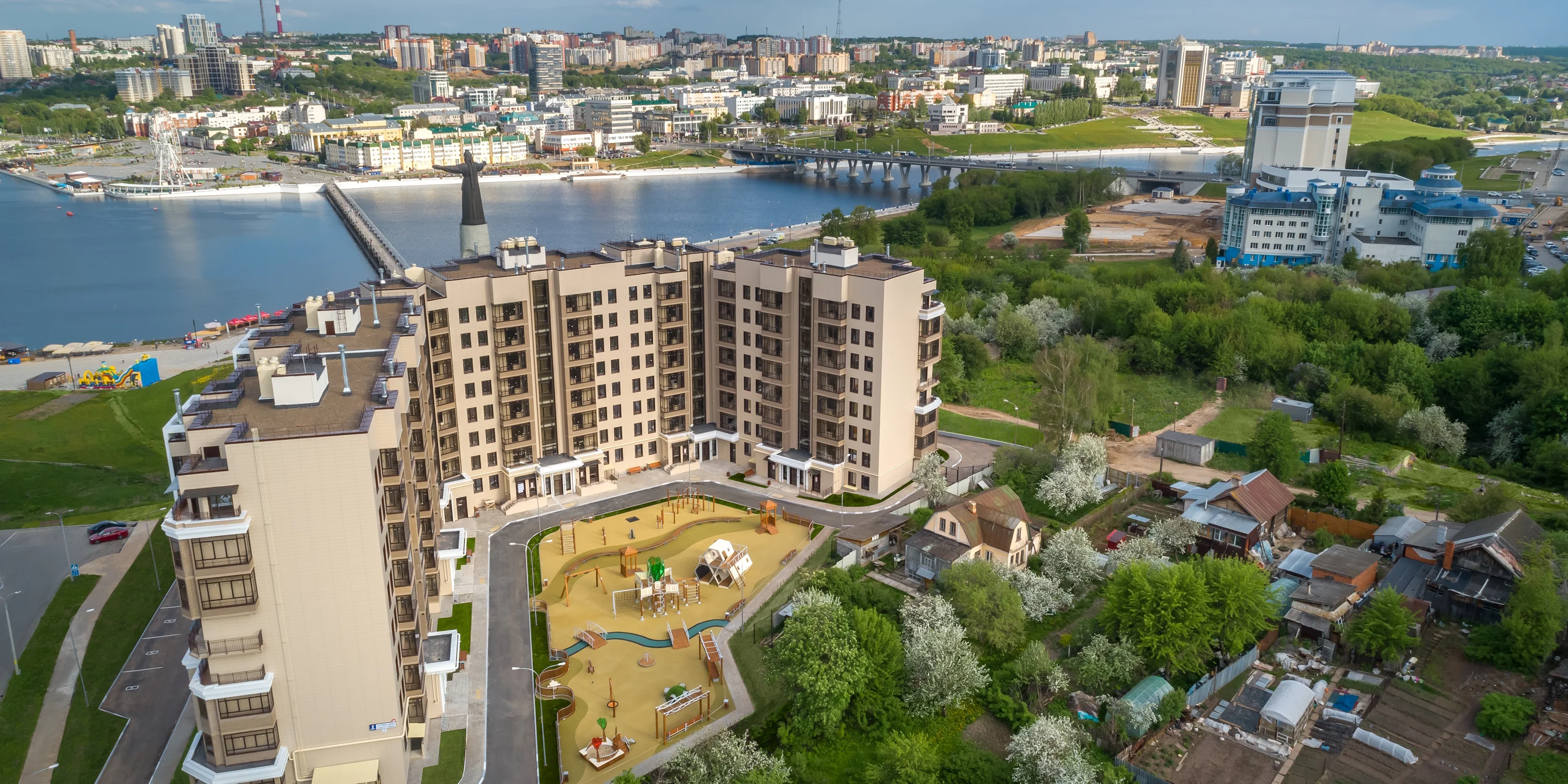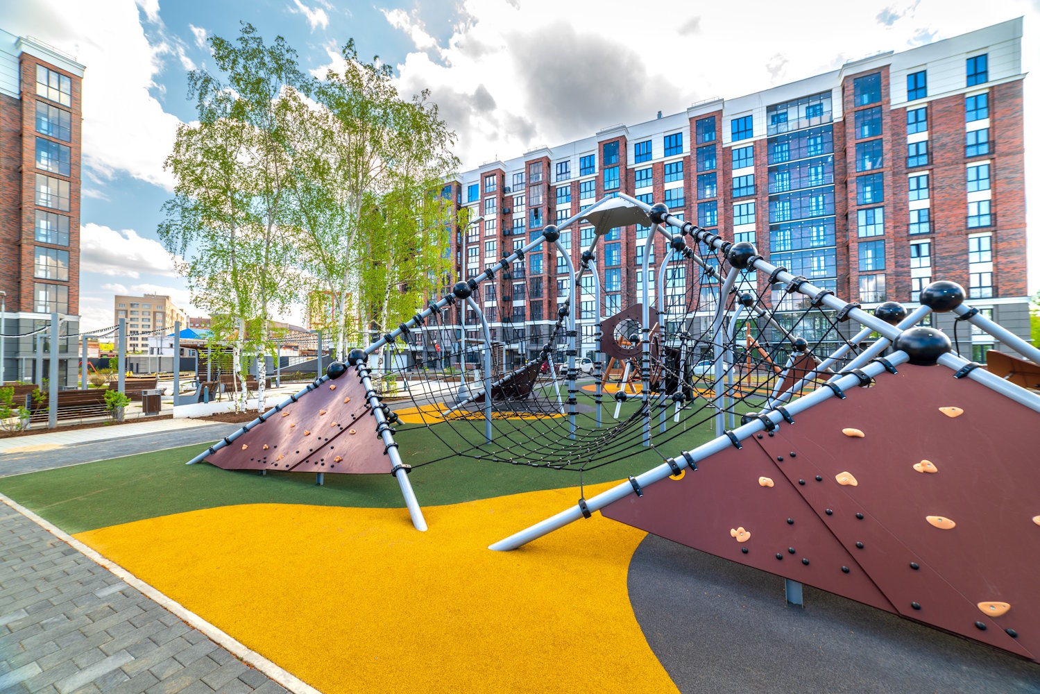 Придомовая территория полностью огорожена, что исключает проникновение на нее посторонних лиц. Выполнена концепция «двор без машин», большое внимание уделено озеленению и ландшафтному оформлению территории дома. Безбарьерная среда: все входы выполнены на уровне земли.